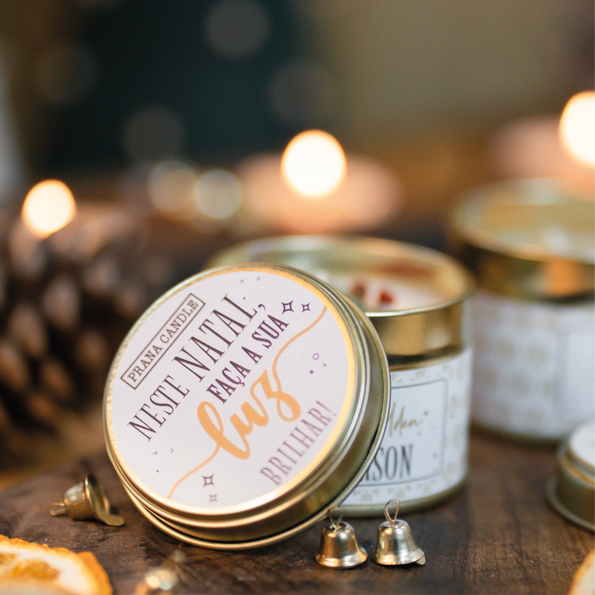 Vela de Natal em recipiente dourado de alumínio. Um pequeno miminho cheiroso de 80g.
